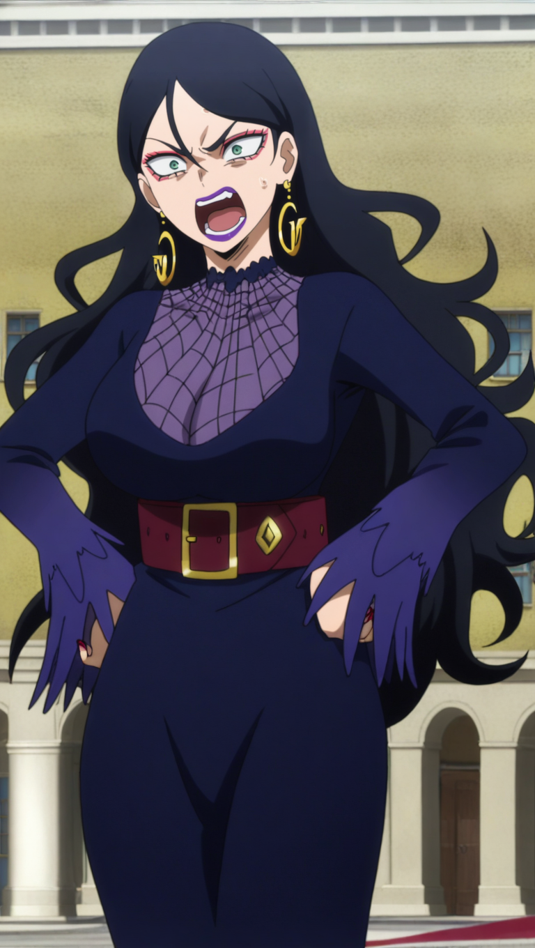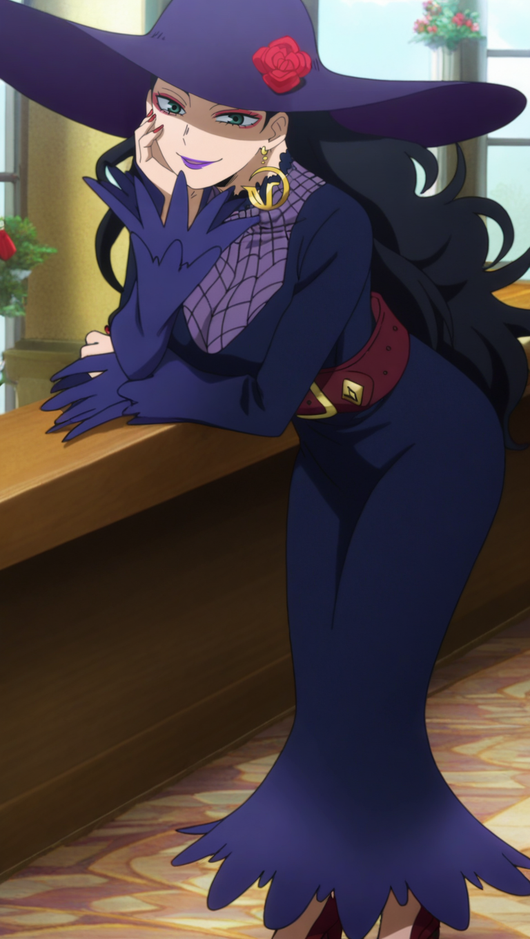 드레스 복장, 보라색 드레스, 긴 소매, 피시넷 가슴 커버, 가슴, 보라색 모자, 꽃, 가슴, 큰 가슴, 빨간 벨트, 빨간 힐, 하이힐, 귀걸이, 메이크업, 아이섀도우, 보라색 립스틱, 네일폴리시,