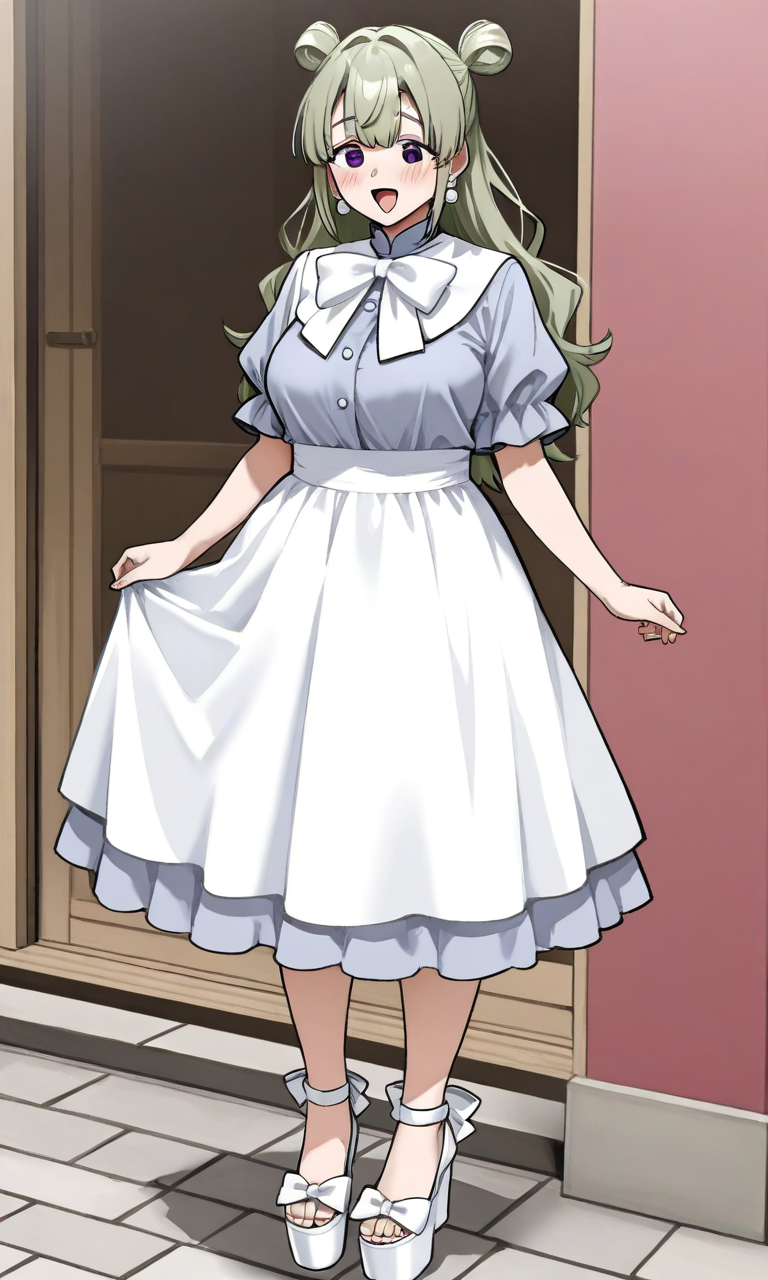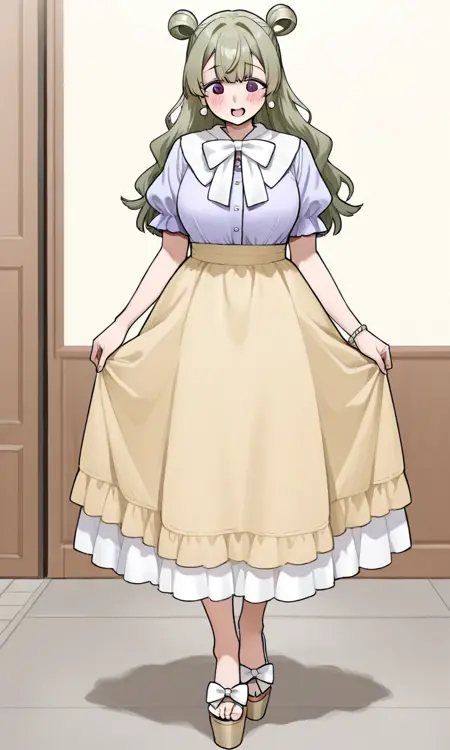 服装:ジュエリー、イヤリング、白いリボン、リボン、スカート、厚底靴、短めの袖、ドレス、靴、ネクタイ、カッパ、シャツ、ふんわりした短い袖、靴のリボン、黄色いドレス