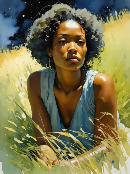 「Nivis」は、リアリズム、ロマン主義、そして現代美術を豊かに融合させたスタイルです。肌や布地の描写には滑らかなブレンド技法が使用され、背景には水彩のぼかしやインクの飛び散りを模した滴やしみがしばしば取り入れられ、現代美術的な質感を加えています。