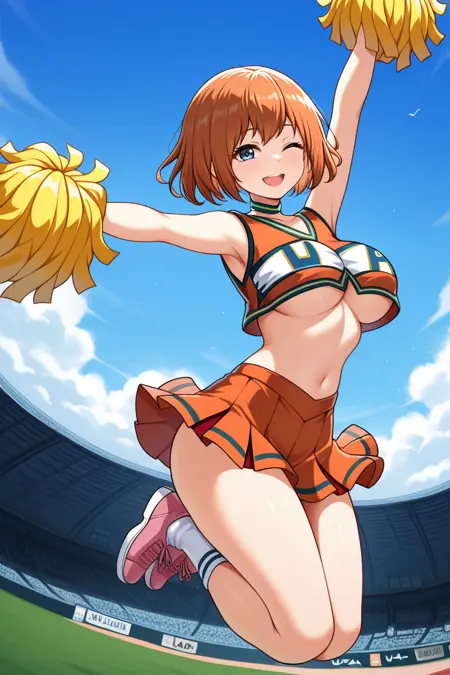 rena, 1girl, orange hair, brown hair, blue eyes, short hair