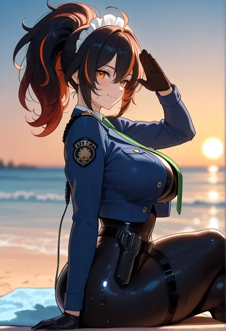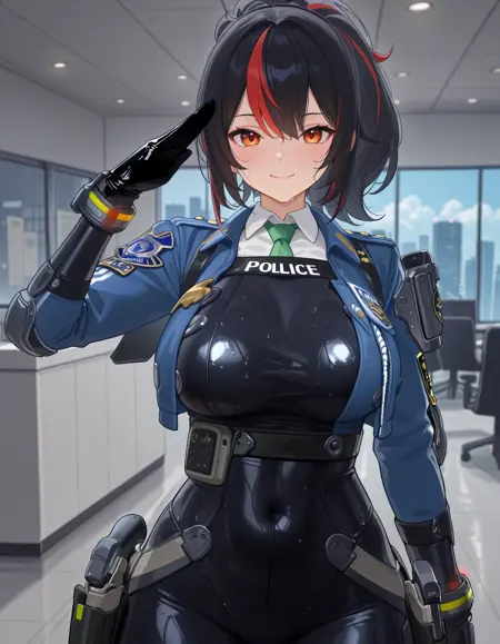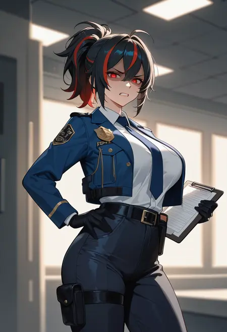 Sample Prompt:1girl, solo, long hair, breasts, shirt, large breasts, black hair, long sleeves, gloves, holding, hair between eyes, closed mouth, standing, jacket, white shirt, ahoge, ponytail, weapon, multicolored hair, sidelocks, cowboy shot, red hair, open clothes, necktie, black gloves, collared shirt, pants, belt, hand up, holding weapon, blurry, streaked hair, open jacket, arm up, uniform, orange eyes, gun, thigh strap, covered navel, blurry background, bodysuit, black pants, blue jacket, holding gun, skin tight, black belt, cropped jacket, handgun, black bodysuit, salute, holster, green necktie, police, police uniform, policewoman
