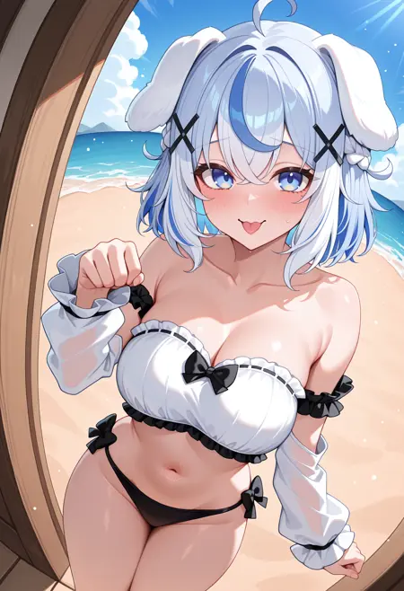 - 투톤 비키니, 땋은 머리, 반쪽 올린 머리, x 머리 장식, 강아지 귀, 흰색 귀, 스트랩리스, 어깨뼈, 검은 레이스, 레이스 트림 비키니, 검은 리본, 흰색 바ン도, 흰색 소매, 분리형 소매, 검은 속옷,