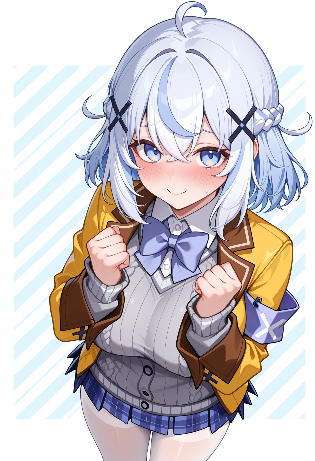 학교 유니폼, 땋은 머리, 반쪽 올린 머리, x 머리 장식, 노랑 재킷, 팔찌, 회색 스웨터, 넥타이, 갈색 트림, 파란 치마, 체크 무늬 치마, 주름 치마, 흰색 팬티스타킹,