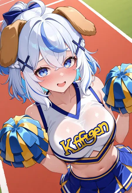 - 체어리리더, 땋은 머리, 반쪽 올린 머리, x 머리 장식, 강아지 귀, 토끼 꼬리, 흰색 크롭탑, 옷에 글자, 파란 트림, 허리, 파란 치마, 줄무늬,