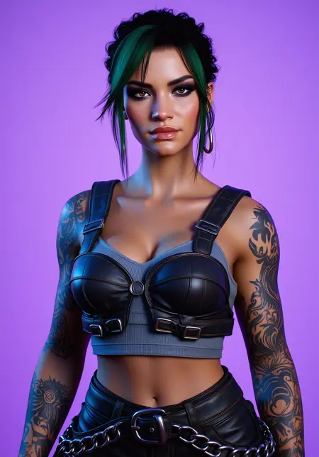 Ch3ri N0wlin, the character from cyberpunk2077, wearing a high-collared, hexagonal-patterned blue and red top, gold hoop earrings, and black lipstick. Her hair is styled in two buns with blue tips, and she has a confident, intense expression. The background is dimly lit with purple and green hues, creating a cyberpunk atmosphere. The image has a gritty, urban feel.