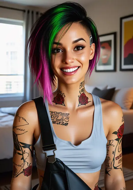 Judy4lv4r3z, a woman with fair skin, stands confidently on a beach with turquoise waves behind her. Her short, edgy hair is dyed green and pink, with a mohawk on one side. She wears a light gray crop top and black overalls. Her skin is tan, and she has multiple tattoos, including roses and script on her chest and arms. The sky is clear, and the setting sun illuminates her.