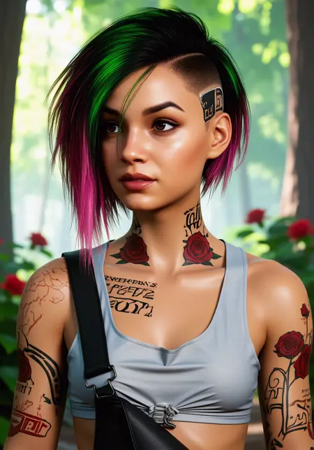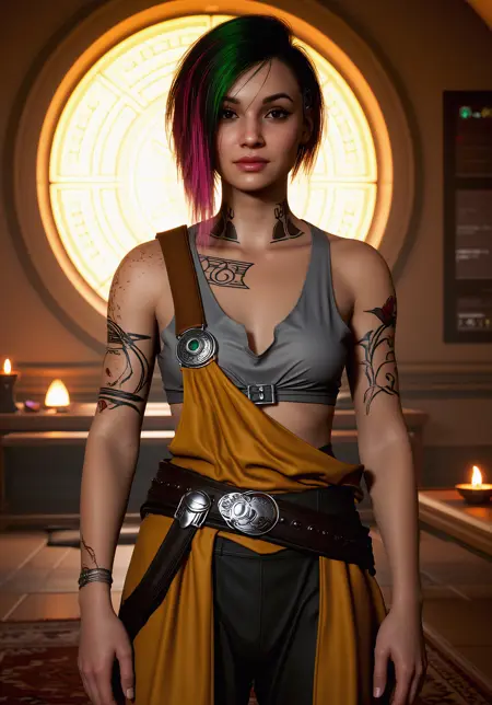 Ch3ri N0wlin, the character from cyberpunk2077, wearing a high-collared, hexagonal-patterned blue and red top, gold hoop earrings, and black lipstick. Her hair is styled in two buns with blue tips, and she has a confident, intense expression. The background is dimly lit with purple and green hues, creating a cyberpunk atmosphere. The image has a gritty, urban feel.