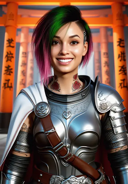 p4n4mp4lm3r, a latina woman, is a muscular, tan-skinned woman with dark hair tied in a messy bun. She wears a torn, red leather jacket over a gray crop top and shorts, revealing a toned midriff. Her expression is determined, with visible scars on her face. She leans against a gritty, post-apocalyptic urban backdrop, with a setting sun casting a warm glow.