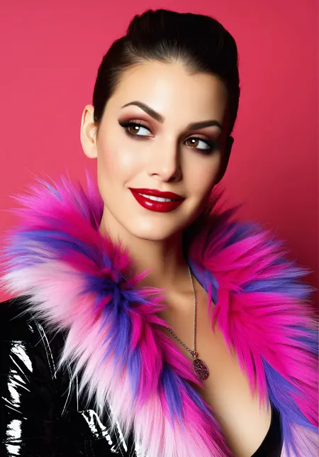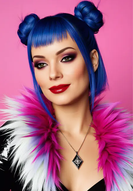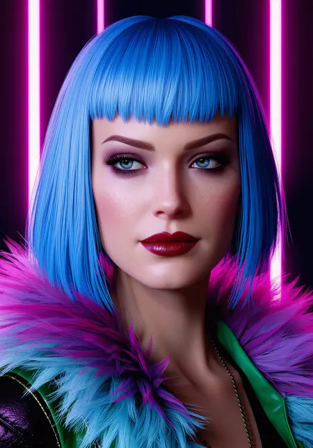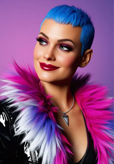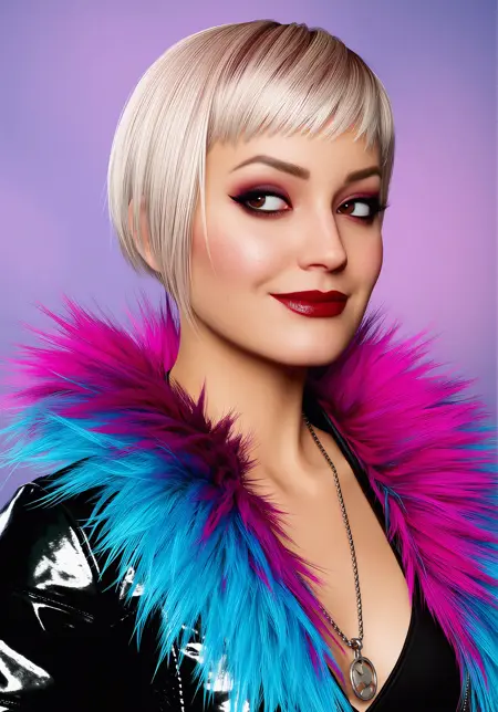 3v3lyn P4rk3r, 창백한 피부를 가진 여성이, 반짝이는 검은 가죽 자켓에 화려하고 털이 많은 분홍색 및 보라색 털 장식을 단 목을 입고, 은색 목걸이와 패endant을 착용했다. 짧고 곧은 파란색 머리에 앞머리가 있으며, 자신감 있고 약간은 흐족한 표정을 지니고 있다. 메이크업은 강렬하며, 검은 아이라인과 진한 빨간 립스틱을 사용했다. 약간 고개를 기울이고, 입술은 수줍은 미소를 지은 채로 있다. 눈은 시청자 쪽을 바라보다가, 멀리 떨어졌다가, 다시 부드럽고 유혹적인 표정으로 돌아온다. 눈썹은 부드럽게 올라가고, 표정은 장난스럽고 수줍고 미소 짓는 사이에서 미묘한 얼굴 움직임으로 변화한다.