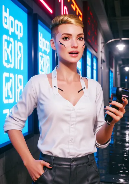 4uror3 C4ss3l,一位法国女性,自信地站在霓虹灯闪烁的都市街道上。她留着短而红褐色的头发,身穿黄色夹克,内搭黑色渔网上衣,凸显丰满的胸部。黑色高腰裤以腰带收束。背景人流熙攘,高楼林立,色彩斑斓的招牌与忧郁的蓝调天空交相辉映。她神情凶悍而坚定。