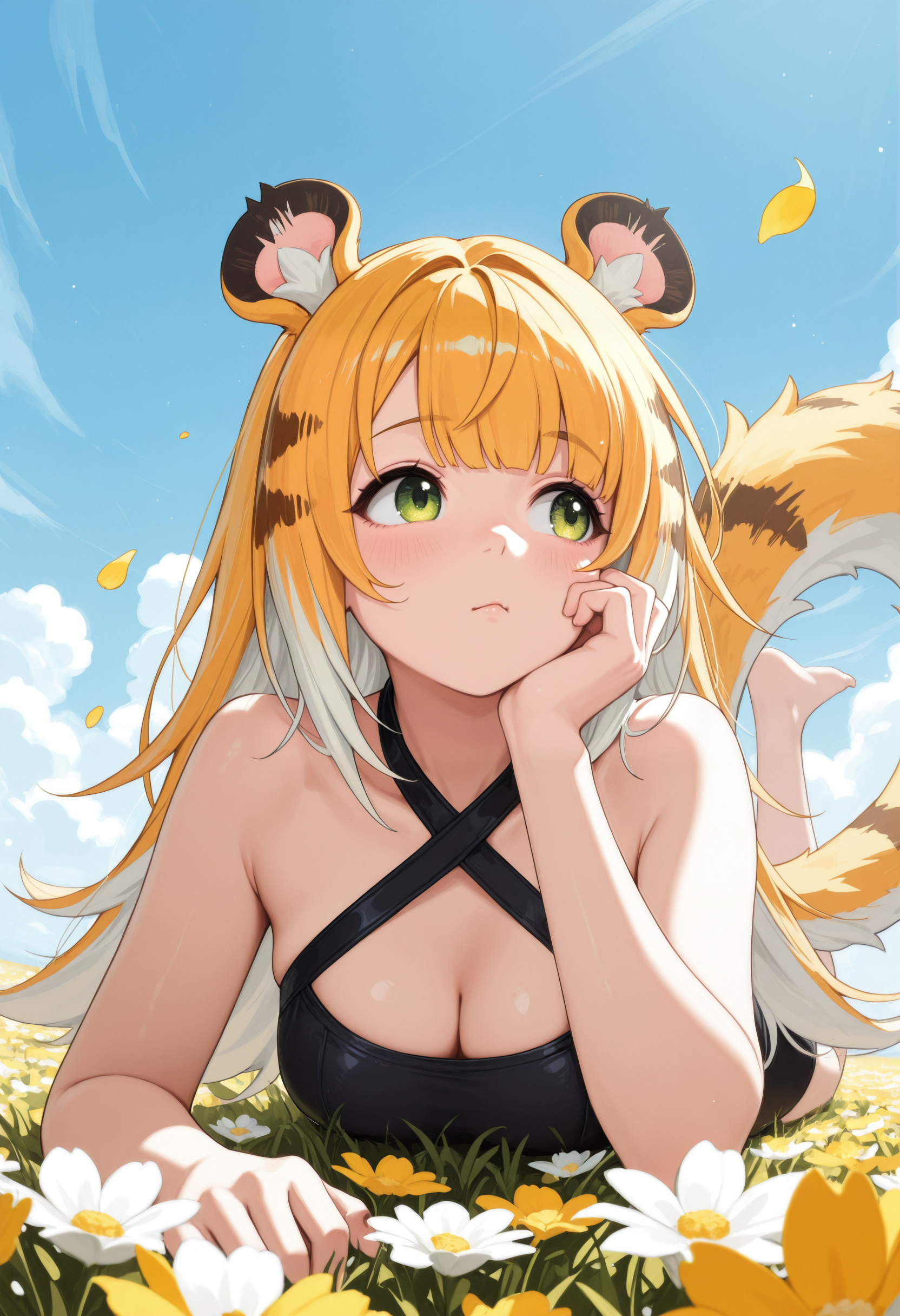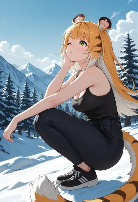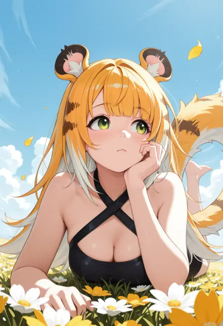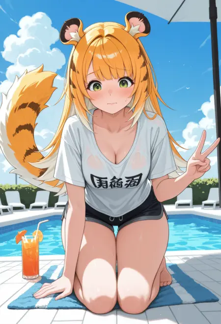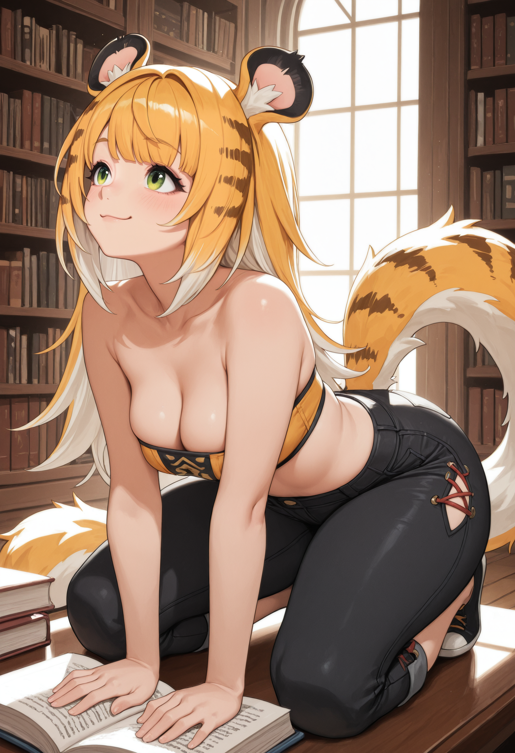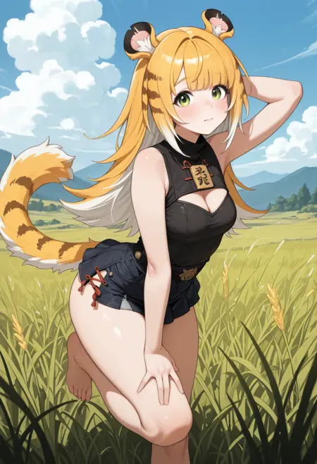 (Positive Prompts) zfufu, tiger girl, tiger tail, tiger ears, animal ear fluf, green eyes, colored inner hair, two-tone hair, multicolored hair, long hair, white hair, blonde hair, small breasts,