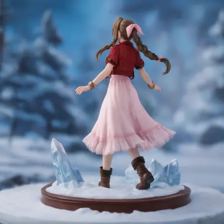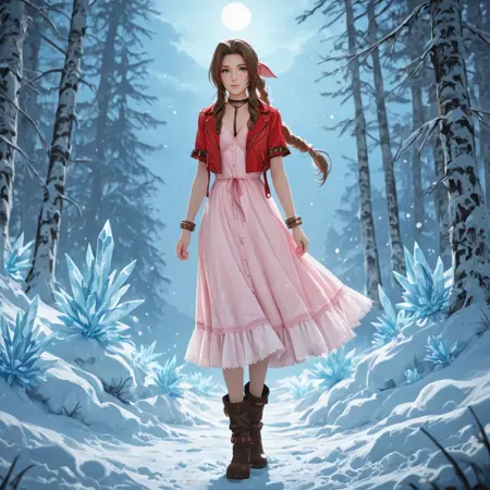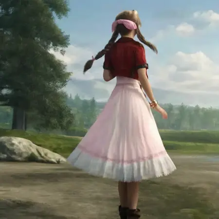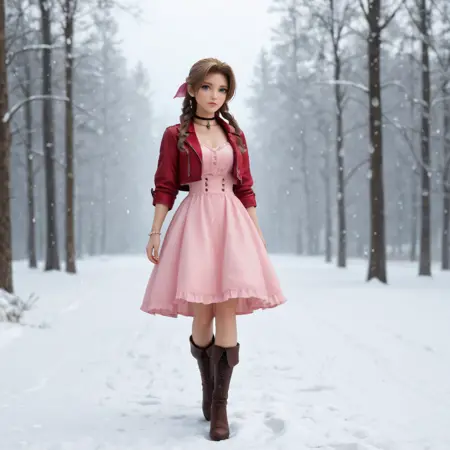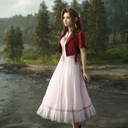 aerith gainsborough,hair ribbon,sidelocks,braid,braided ponytail,parted bangs,green eyes,jewelry,choker,pink bow,pink dress,cropped jacket,open jacket,red jacket,boots,bracelet