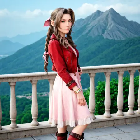 aerith gainsborough,hair ribbon,sidelocks,braid,braided ponytail,parted bangs,green eyes,jewelry,choker,pink bow,pink dress,cropped jacket,open jacket,red jacket,boots,bracelet