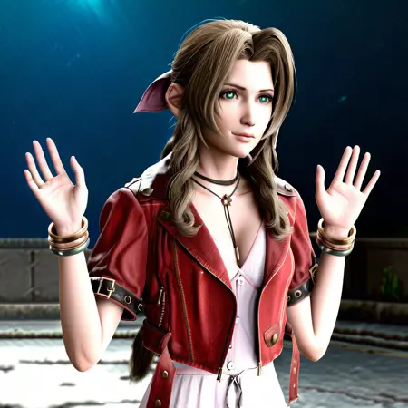 aerith gainsborough,hair ribbon,sidelocks,braid,braided ponytail,parted bangs,green eyes,jewelry,choker,pink bow,pink dress,cropped jacket,open jacket,red jacket,boots,bracelet