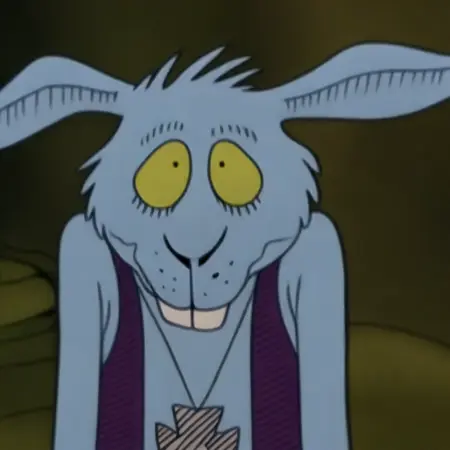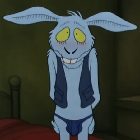 anthro, furry, fur, male, solo, rabbit, rabbit ears, light blue fur, light blue body, blueftc, 1boy, buckteeth, yellow eyes, purple vest, open vest, necklace, iron cross necklace, brown wristbands, dark blue boots,
