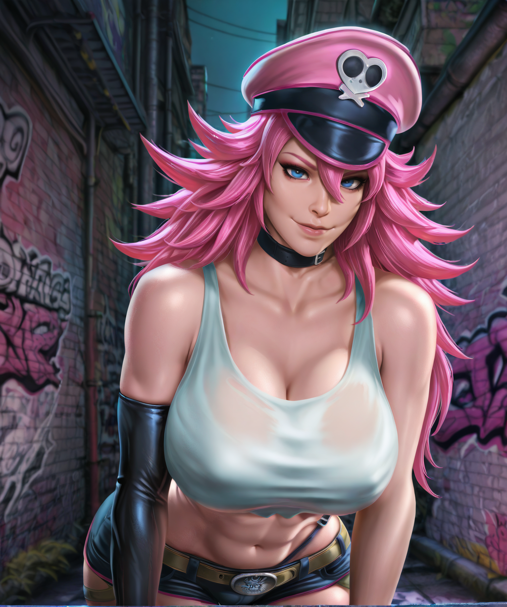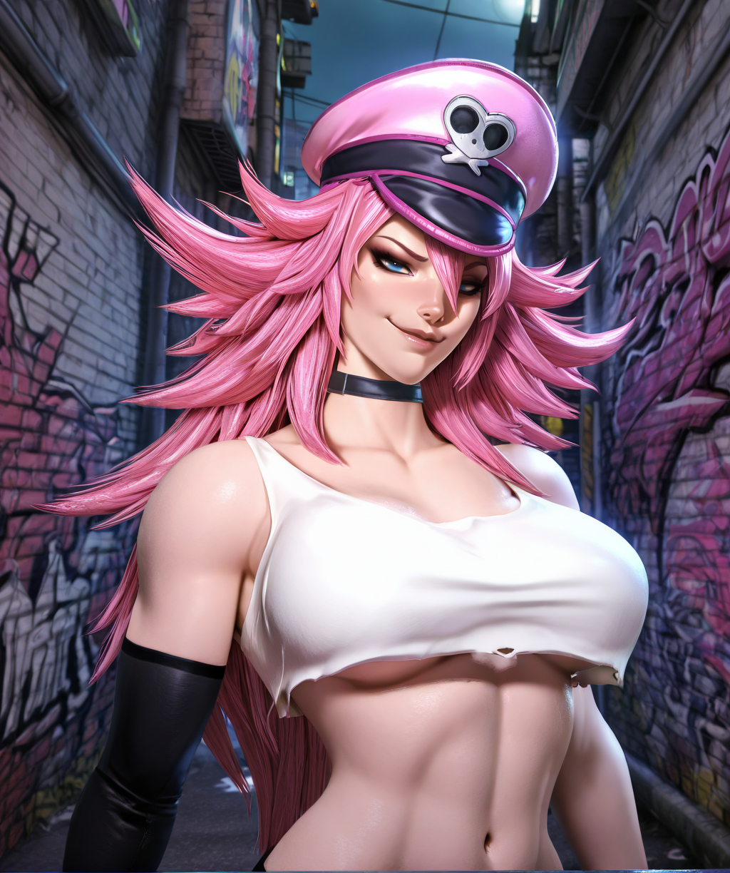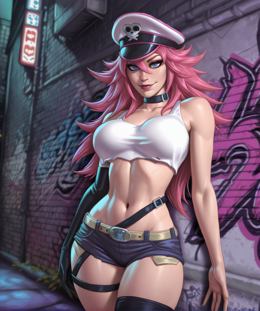 흰색 크롭탑, - 분홍색 뾰족한 모자, - 한쪽 팔꿈치 장갑, 한쪽 허벅지 스타킹, 칼라, 짧은 반바지, 분홍색 하이힐, - 비대칭 옷,