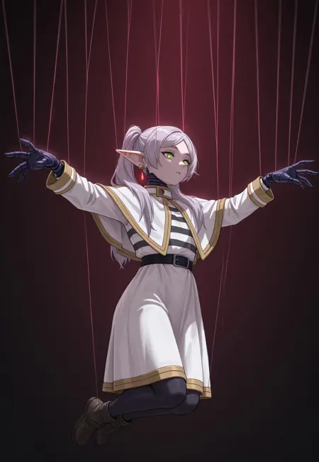Puponstrmb2, puppet strings, marionette pose, suspended in air, manipulated body, glowing string,