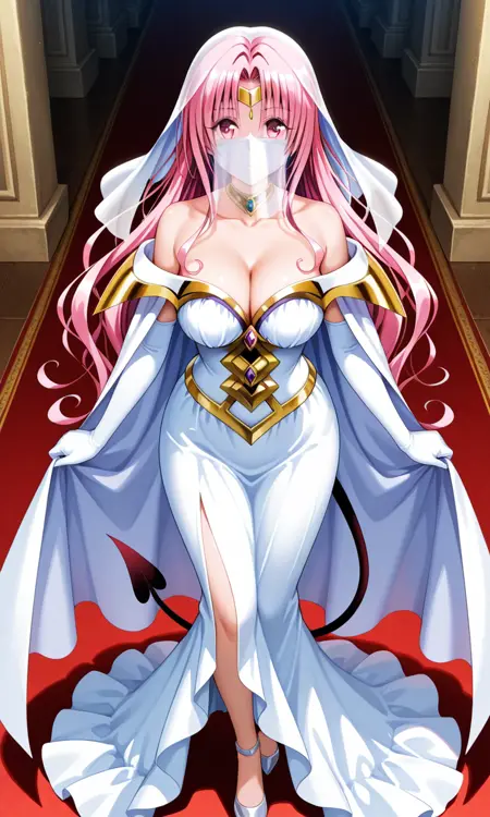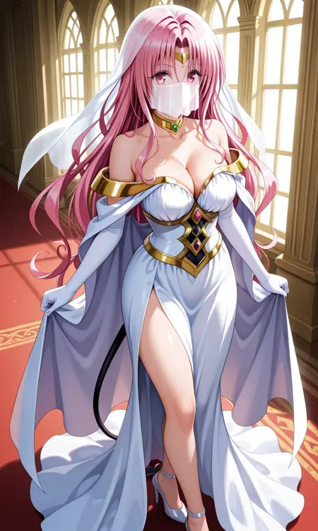 Sephie Michaela Deviluke (To Love Ru OVA/Manga), very long hair, pink hair, circlet, hair between eyes, parted bangs, pink eyes, large breasts, demon tail, thighs, collarbone, bare shoulders, choker, cleavage, white cape, off-shoulder dress, white dress, long dress, elbow gloves, high heels, veil, covered face