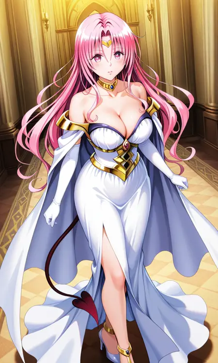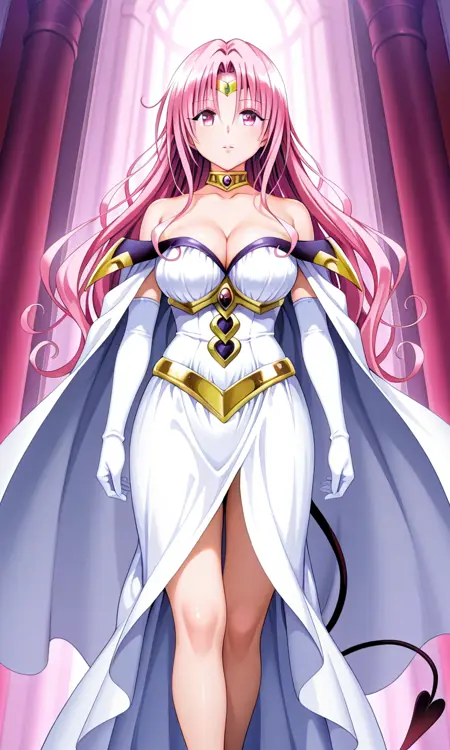 Sephie Michaela Deviluke (To Love Ru OVA/Manga), very long hair, pink hair, circlet, hair between eyes, parted bangs, pink eyes, large breasts, demon tail, thighs, collarbone, bare shoulders, choker, cleavage, white cape, off-shoulder dress, white dress, long dress, elbow gloves, high heels