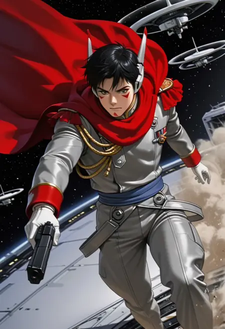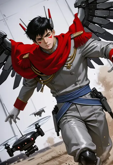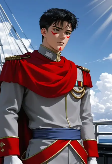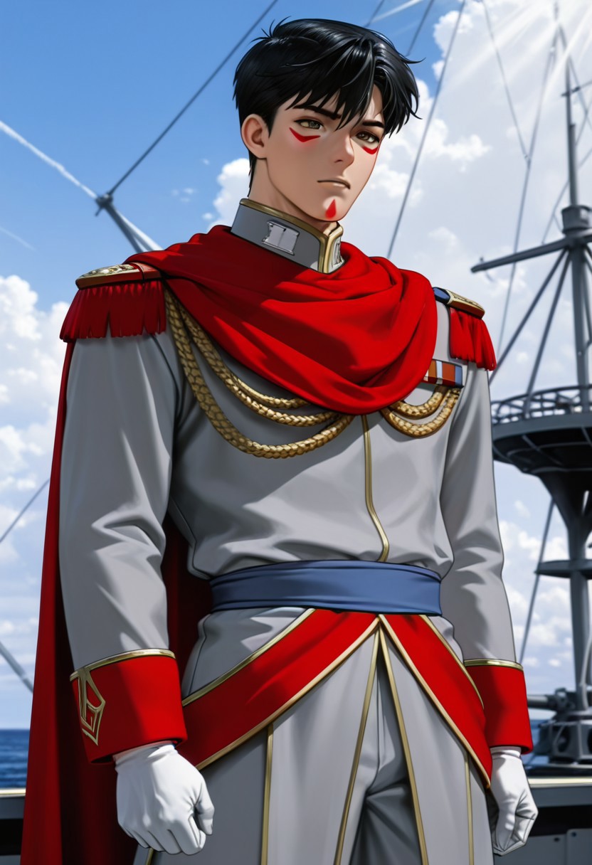 grey high collar shirt, long sleeves, white gloves, grey pants, blue sash, red cape, epaulettes, aiguillette
