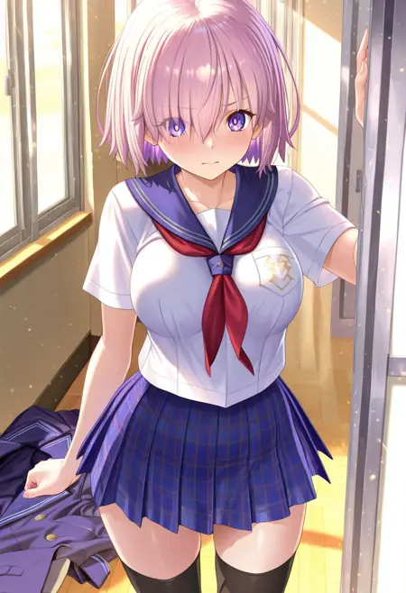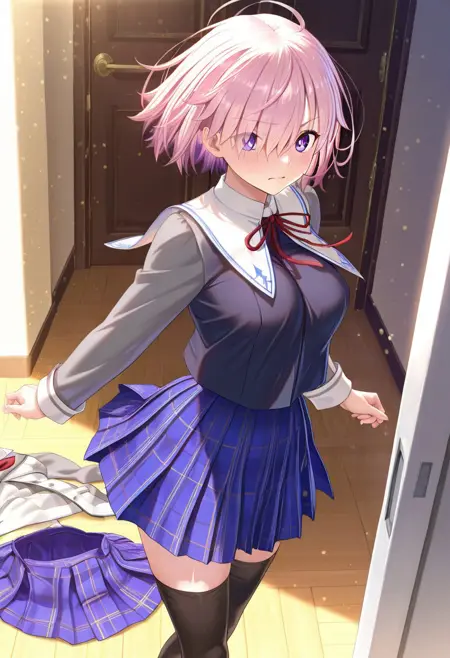 2nd: 1girl, Mashu Kyrielight, 한쪽 눈을 가린 머리, 보라색 눈, 단발, 분홍색 머리, 허벅지 길이 양말, 치마, 머리 장식 제거, 학교 교복,
