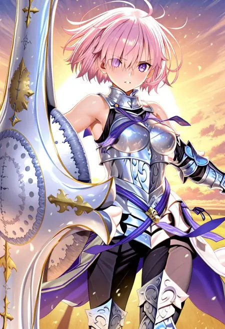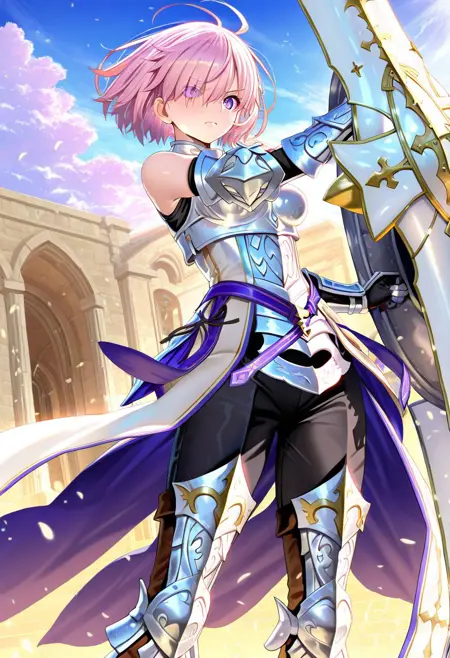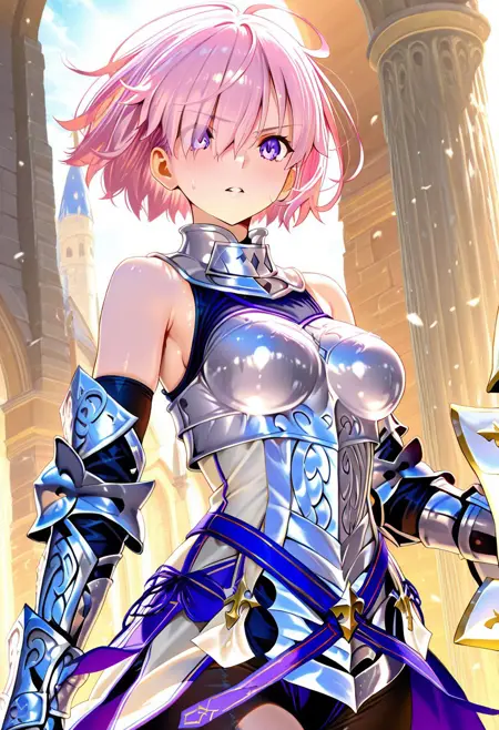 Paladin: 1girl, Mashu Kyrielight, 한쪽 눈을 가린 머리, 보라색 눈, 단발, 분홍색 머리, Paladin, 흰색 갑옷, 흰색 방패, lord camelot (fate),