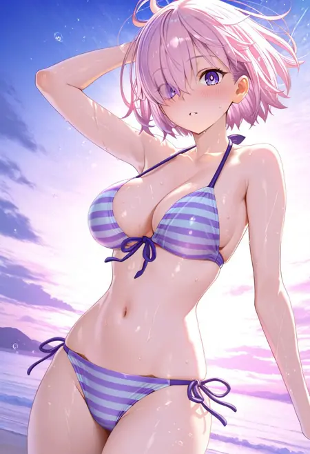 swim: 1girl, Mashu Kyrielight, 한쪽 눈을 가린 머리, 보라색 눈, 단발, 분홍색 머리, 수영복, 줄무늬 비키니, 비키니,