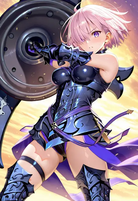 1st: 1girl, Mashu Kyrielight, 한쪽 눈을 가린 머리, 보라색 눈, 단발, 분홍색 머리, lord camelot (fate), 검은색 갑옷, 검은색 방패,