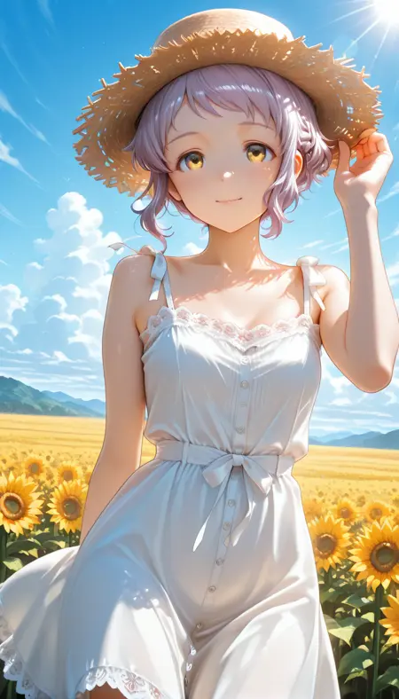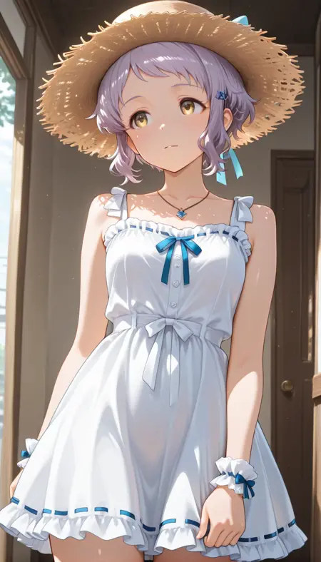 ドレス、帽子、リボン、リボン、ジュエリー、肩出し、鎖骨、太もも、フリル、ノースリーブ、白いドレス、ネックレス、手首のカフス、腕出し、ノースリーブドレス、フリル付きドレス、スクランチ、青いリボン、リボン縁取り、ペンダント、サンハット、わら帽子、手首スクランチ、サンドレス、リボン縁取り服、リボン縁取りドレス、