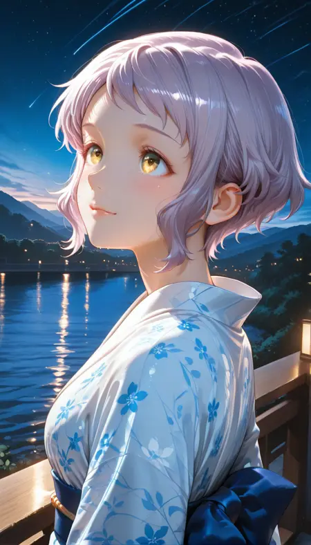 IMMakaMizu、胸、短い髪、黄色い目、紫の髪、サイドロックス、波状の髪、小さな胸、