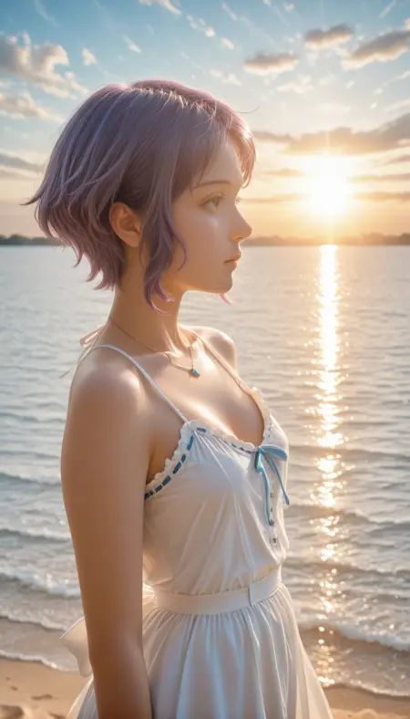 髪飾り、ドレス、持っている、肩出し、鎖骨、太もも、ノースリーブ、髪の花、白いドレス、腕出し、ノースリーブドレス、足出し、短いドレス、太もも隙間、タオル、スパゲッティストラップ、サンドレス、タオルを持っている、透けるシルエット、