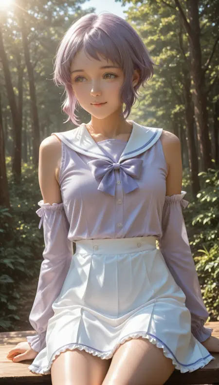シャツ、スカート、長袖、リボン、学校制服、太もも、プリーツスカート、フリル、取り外し可能な袖、ノースリーブ、ネクタイ、セーラーカラー、青いリボン、白いスカート、フリル付きスカート、フリル付き袖、白いセーラーカラー、紫のリボン、ハイウエストスカート、青いネクタイ、紫のシャツ、紫のネクタイ、肩出し、ミニスカート、ノースリーブシャツ、ボタン、