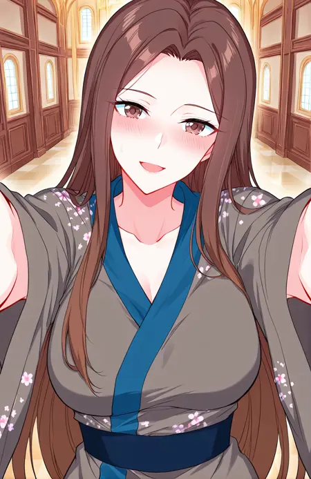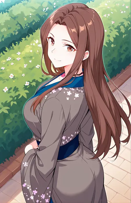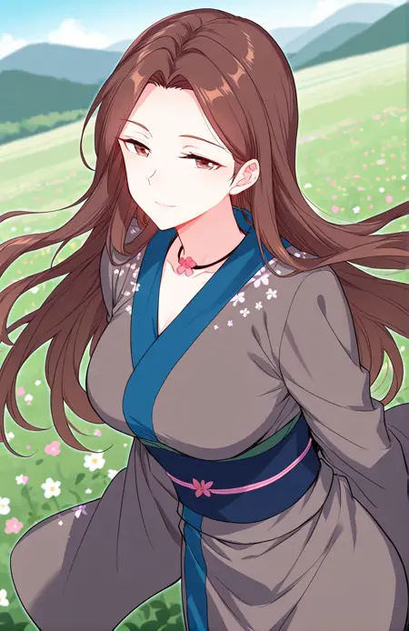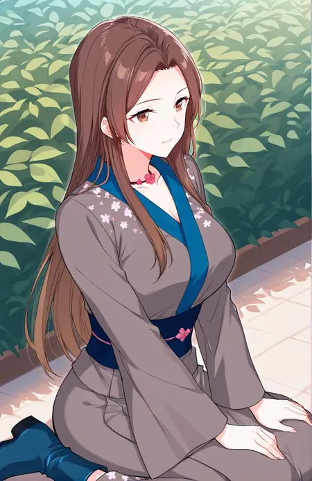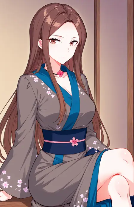 Cai, 1 girl, solo, brown eyes, long hair, straight hair, brown hair, center parted bangs, long sidelocks, mature woman,