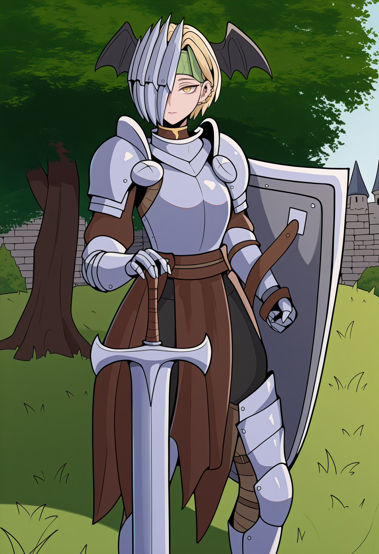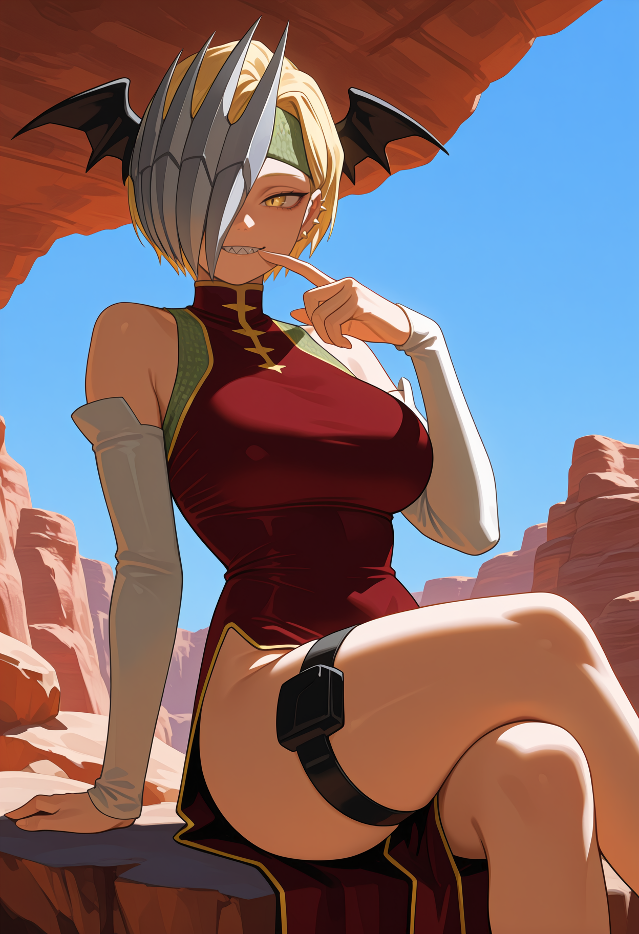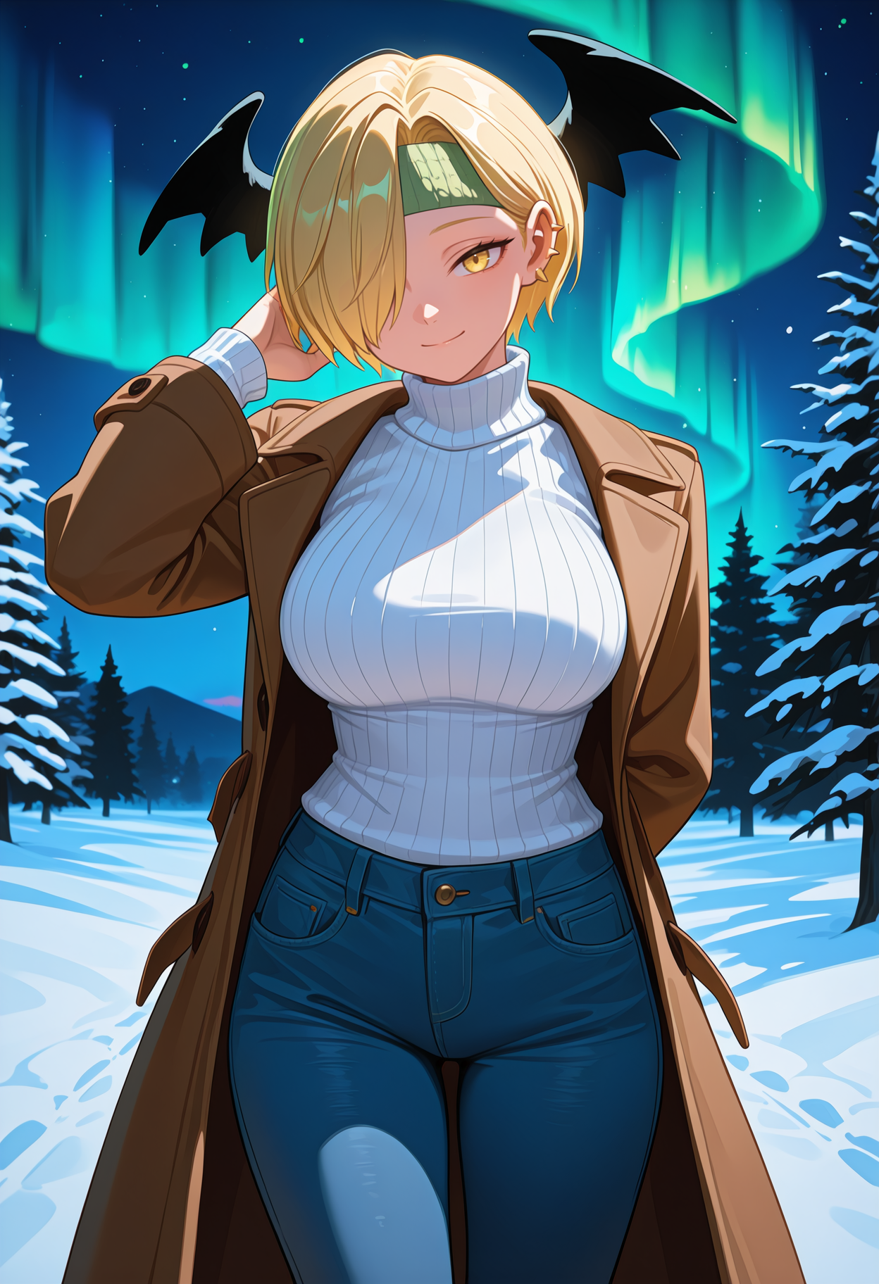 外观: 耳洞,短发,金发,头发遮住一只眼睛,头部翅膀,黄眼睛,大胸部