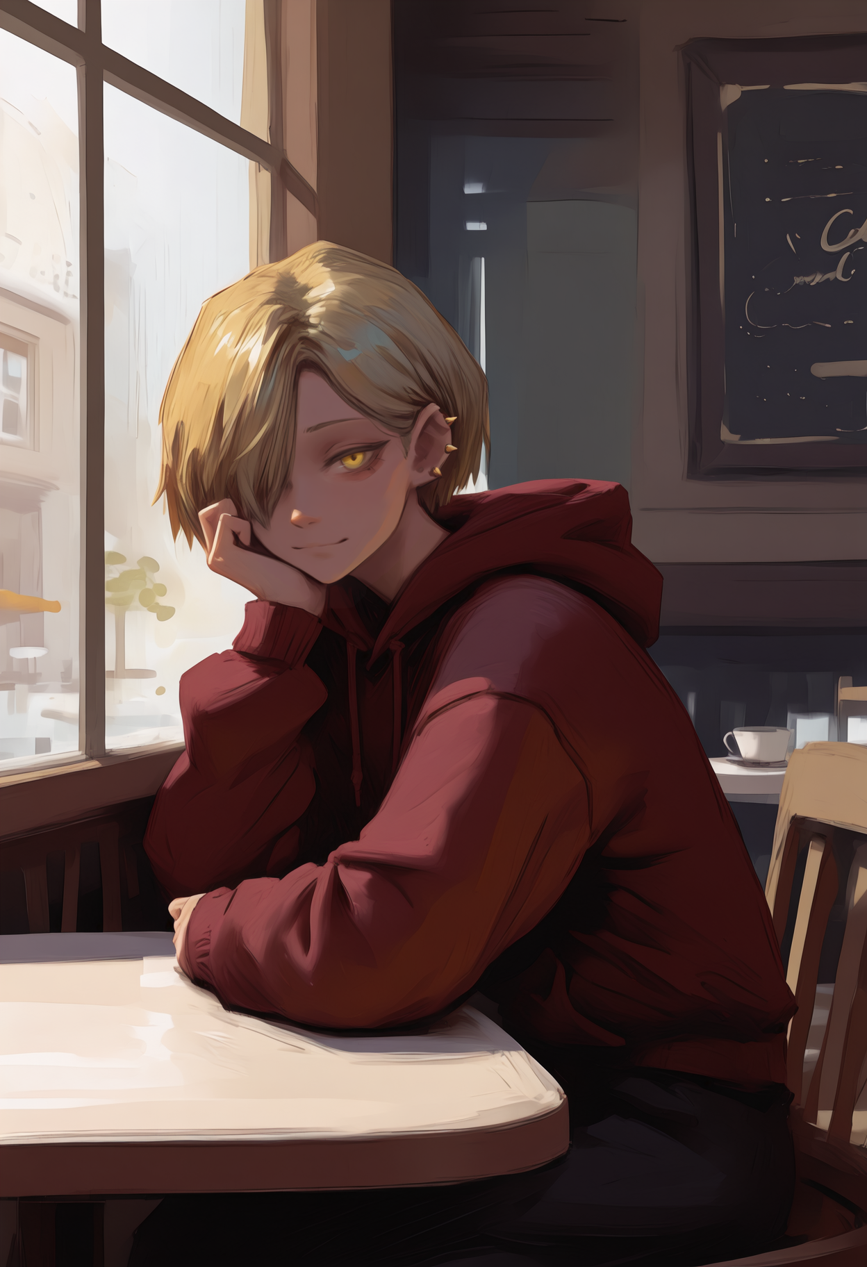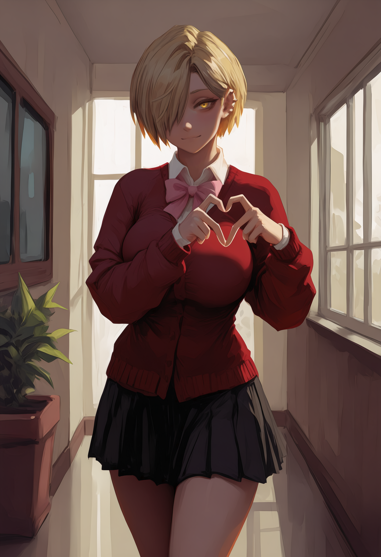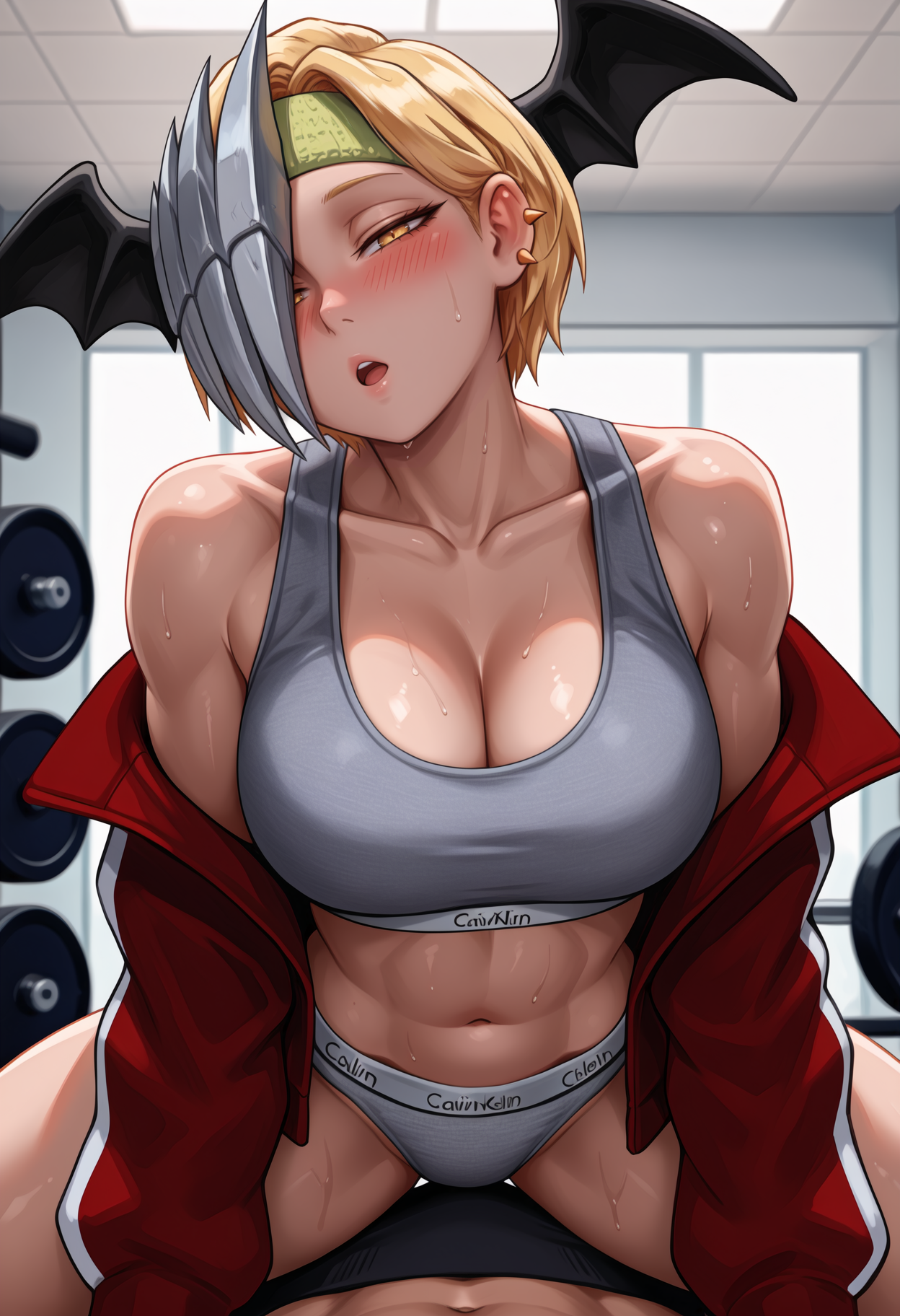 外观: 耳洞,短发,金发,头发遮住一只眼睛,头部翅膀,黄眼睛,大胸部