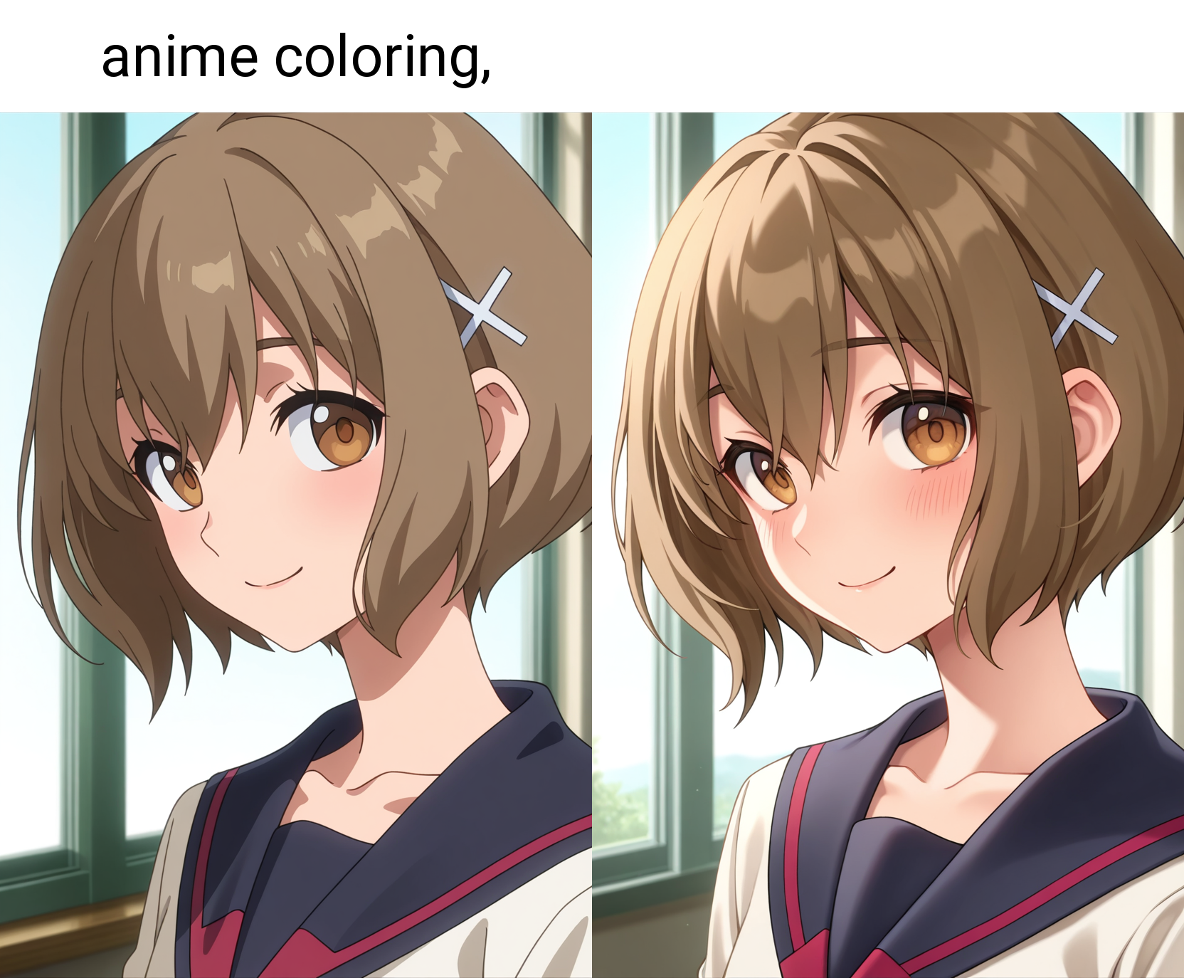 プロンプトに"anime coloring"を使った方が、アニメの雰囲気に近くなります。