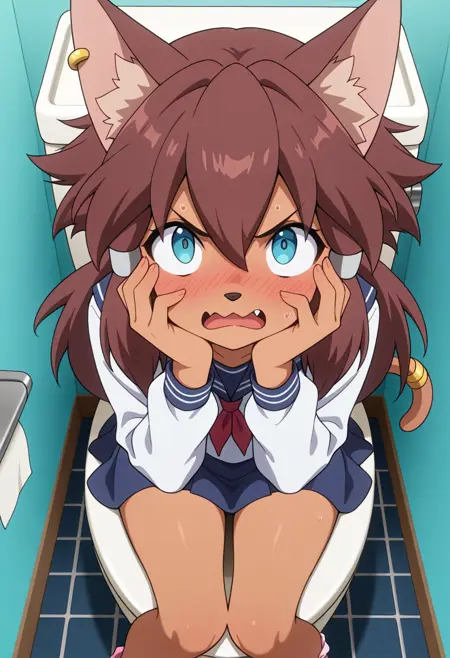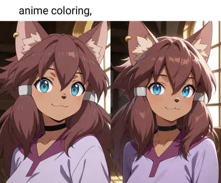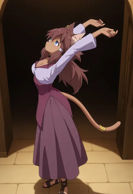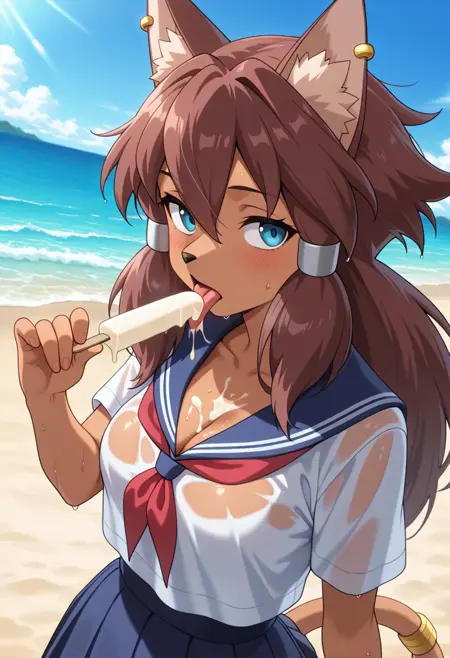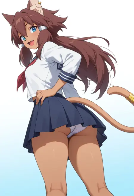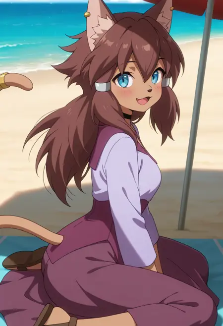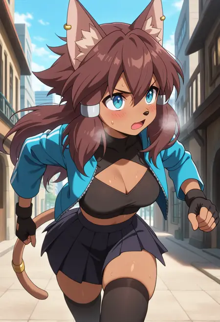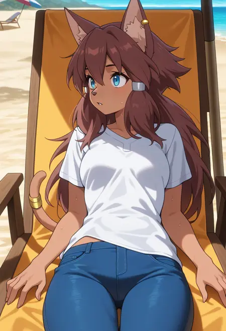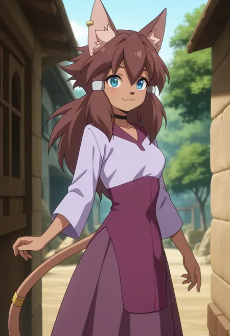 maiyaww, furry female, dark-skinned female, animal ears, animal ear fluff, animal nose, blue eyes, brown hair, long hair, hair between eyes, sidelocks, hair tubes, earrings, tail, tail ornament,