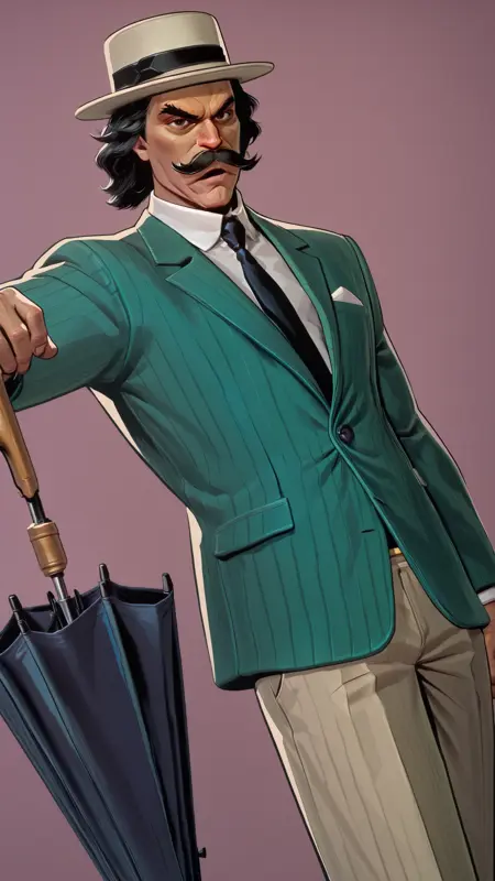 1boy, turn3r, suit, hat, necktie, green suit, tan pants, mustache, stripped suit,