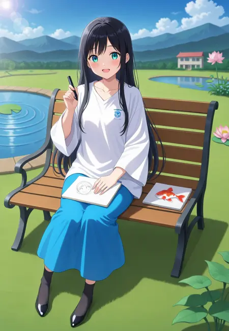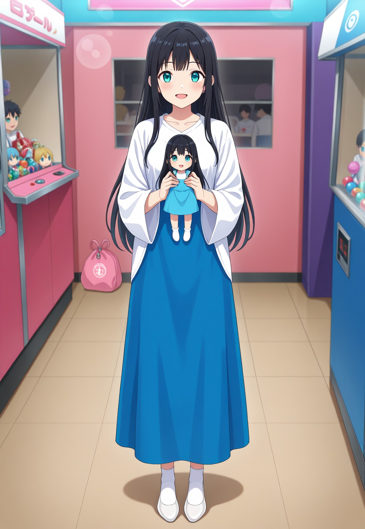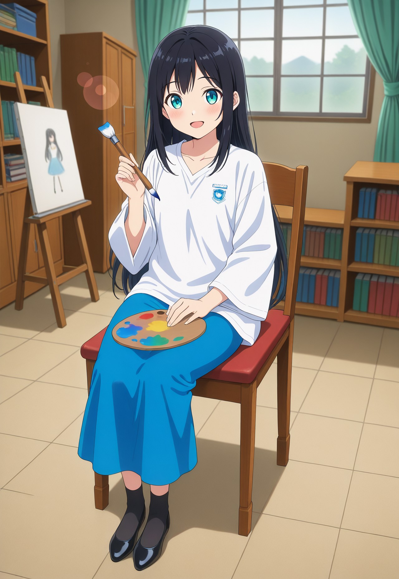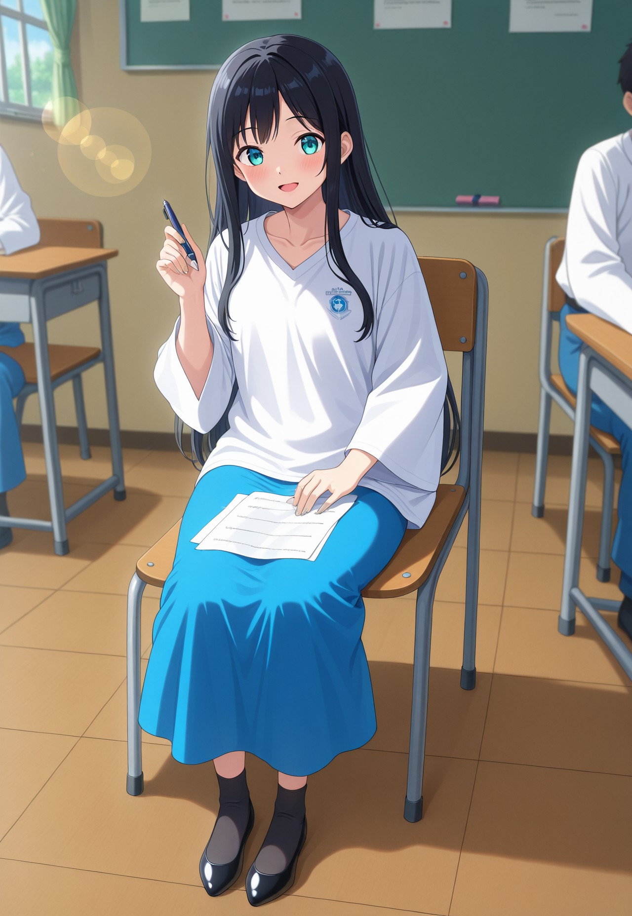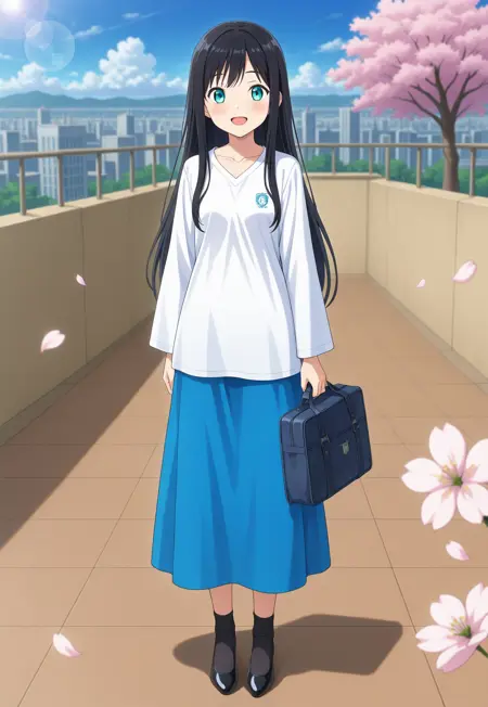 (school_baju_kurung),(schoollogo),(dress),(collarbone),(white shirt),(wide sleeves),(blue skirt),(long skirt)
