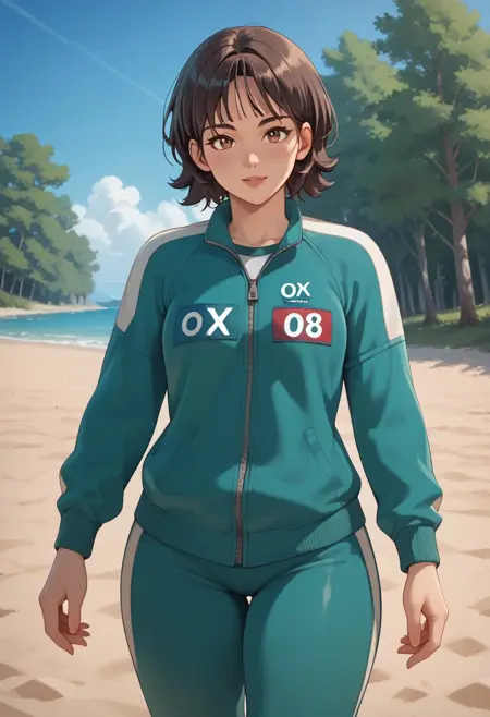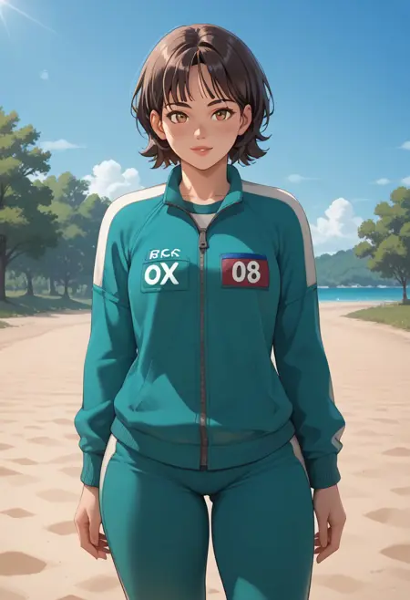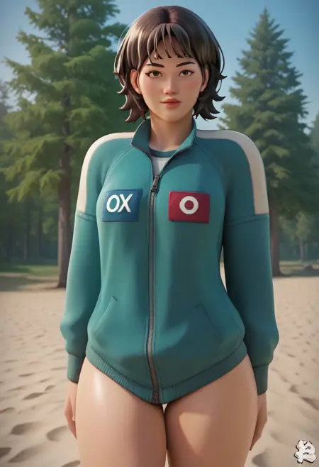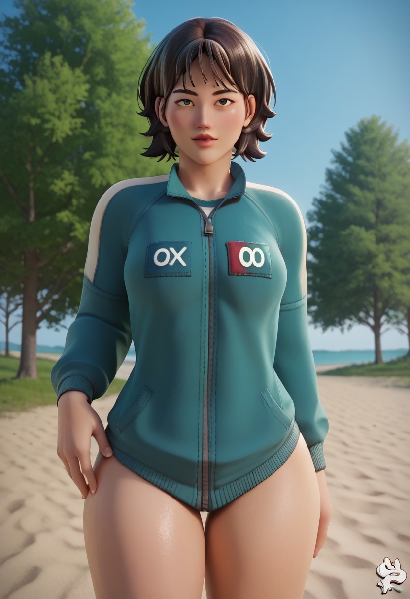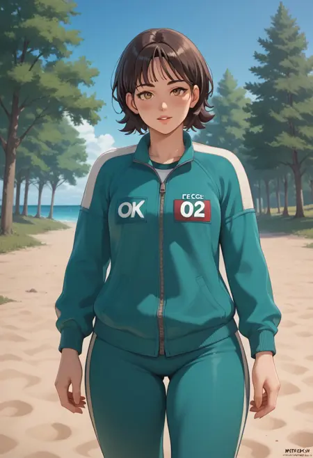 GlassBridgeSurvivor, 1girl, short hair, dark brown hair, bangs, parted bangs, hair between eyes, long sleeves, number on clothes, 067, 3d render, light skin, green tracksuit, track jacket, green track pants, white slip-on shoes,