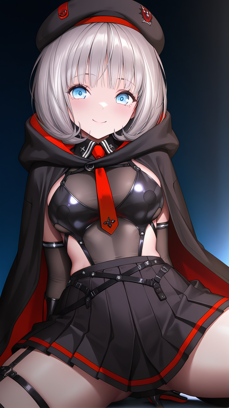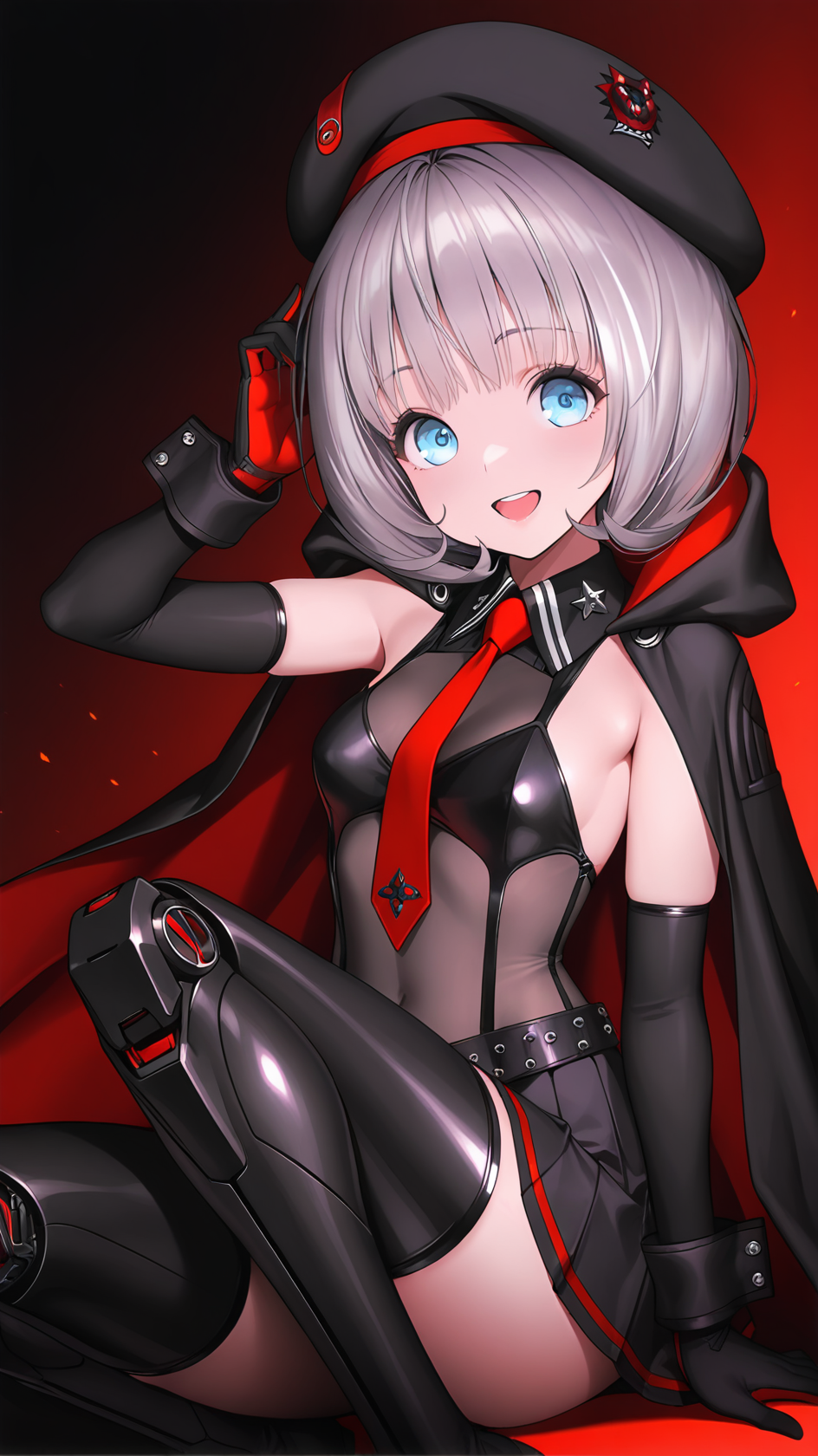 예시 프롬프트: vestios,1girl, beret, black headwear, blue eyes, grey hair, short hair, red necktie, pleated skirt, necktie, black gloves, elbow gloves, black skirt, thigh boots, black cloak, black coat, mechanical legs, boots, hood,
