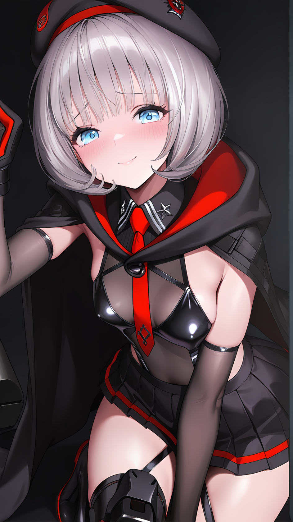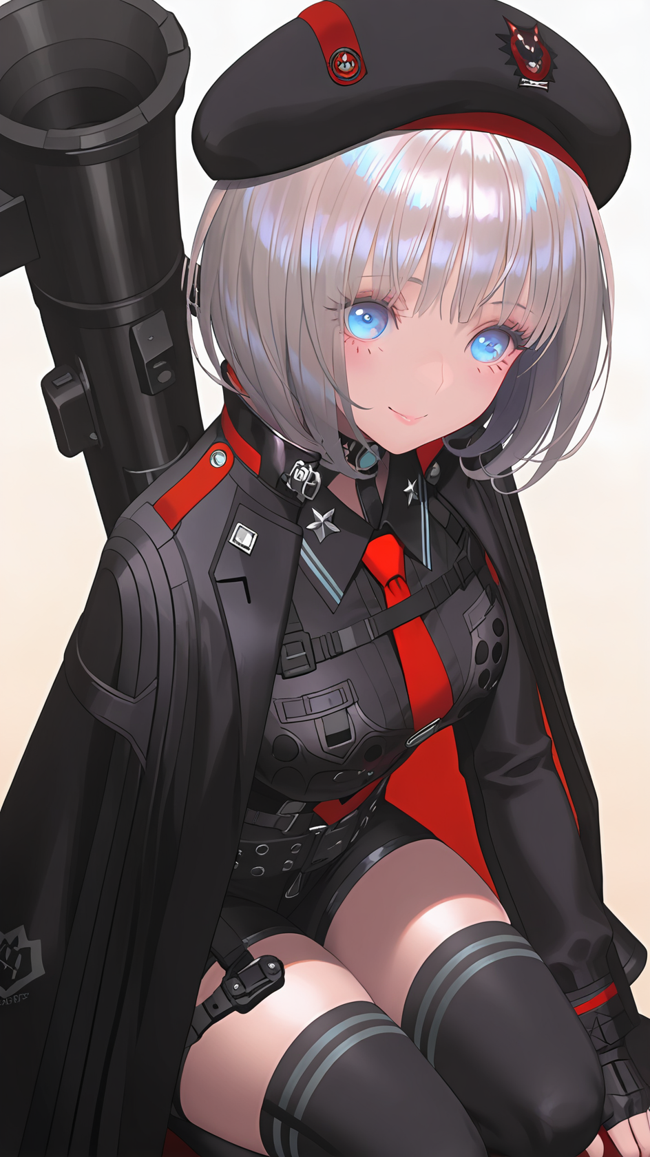 예시 프롬프트: ,1girl, beret, black headwear, blue eyes, grey hair, short hair, red necktie, pleated skirt, necktie, black gloves, elbow gloves, black skirt, thigh boots, black cloak, black coat, mechanical legs, boots, hood,