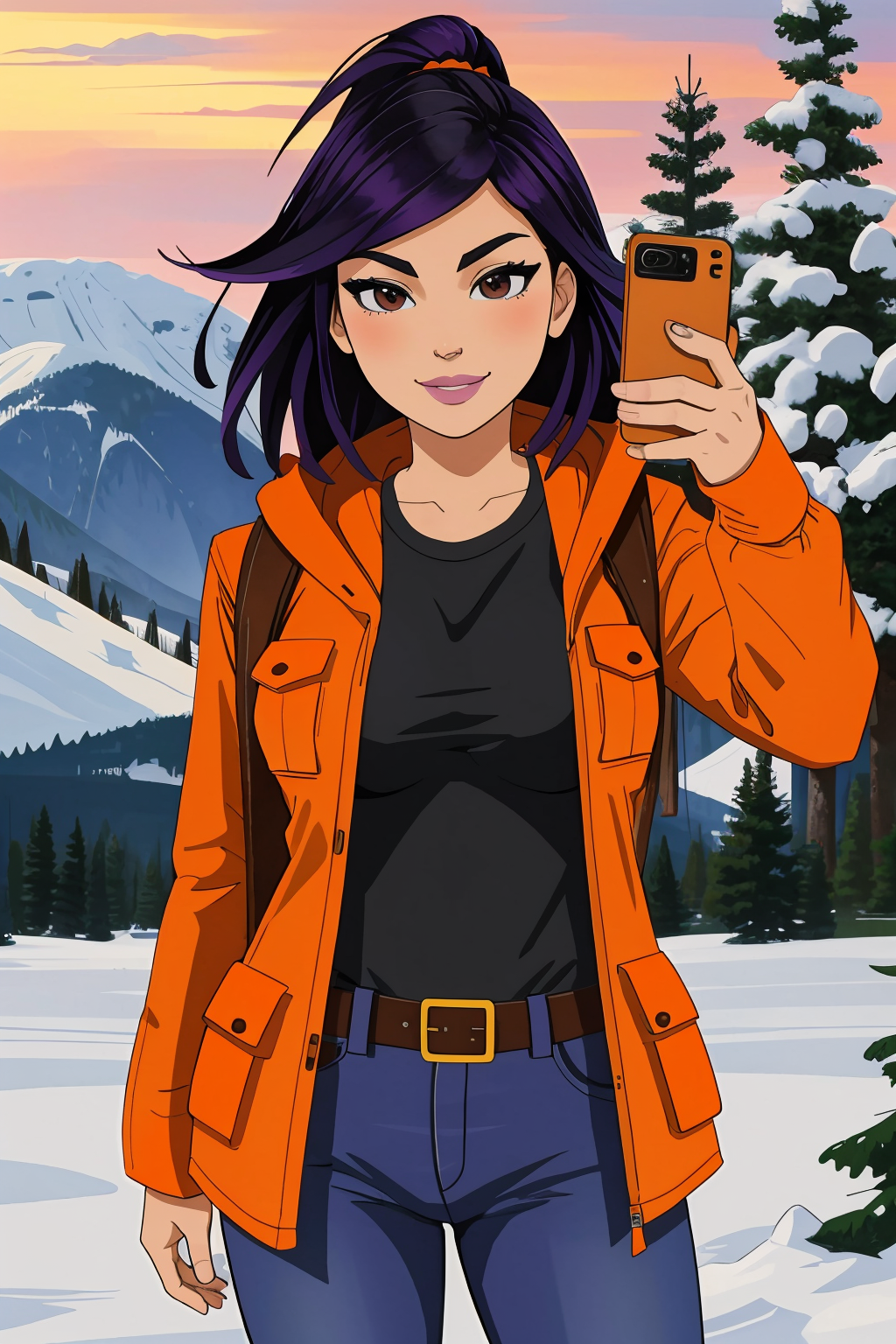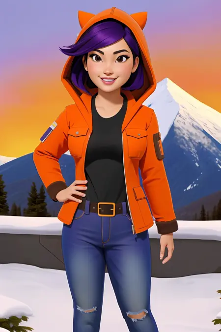 학습된 단어(원하는 것을 사용하세요): 오렌지 파커, 후디, 검정 부츠, 청바지, 벨트, 검정과 보라색 머리카락, 립스틱. 그/그녀를 더 아시아적으로 만들고 싶다면 'asian' 태그를 추가하세요!