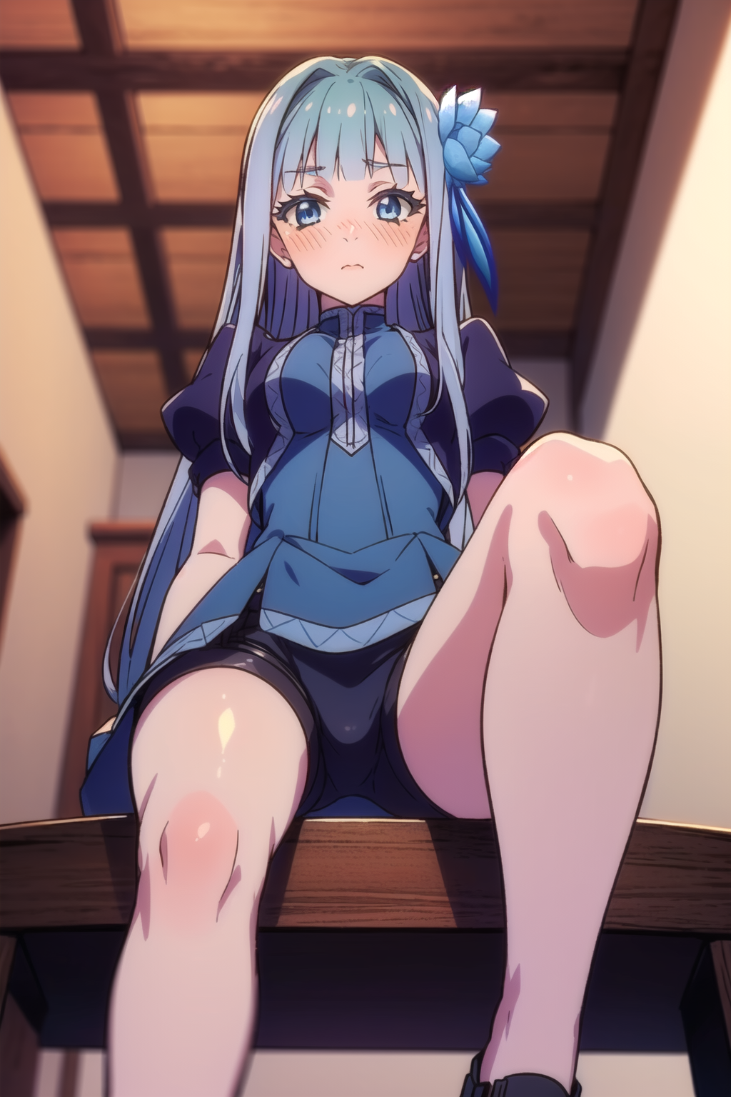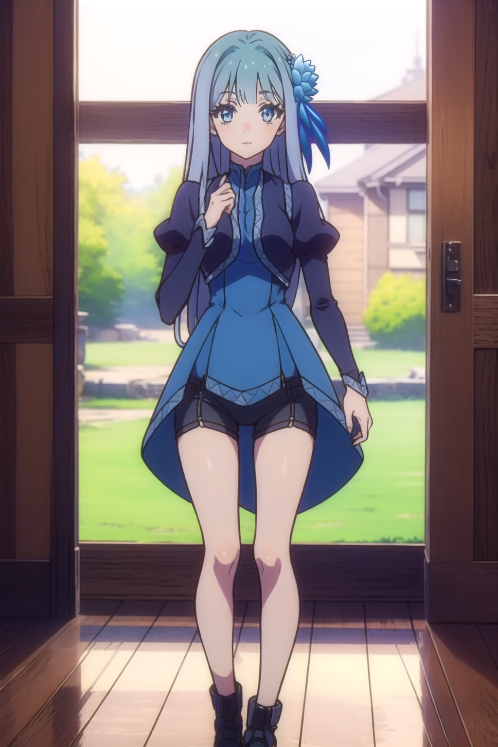 基础提示词:mabel, 蓝色长发, 发饰花,