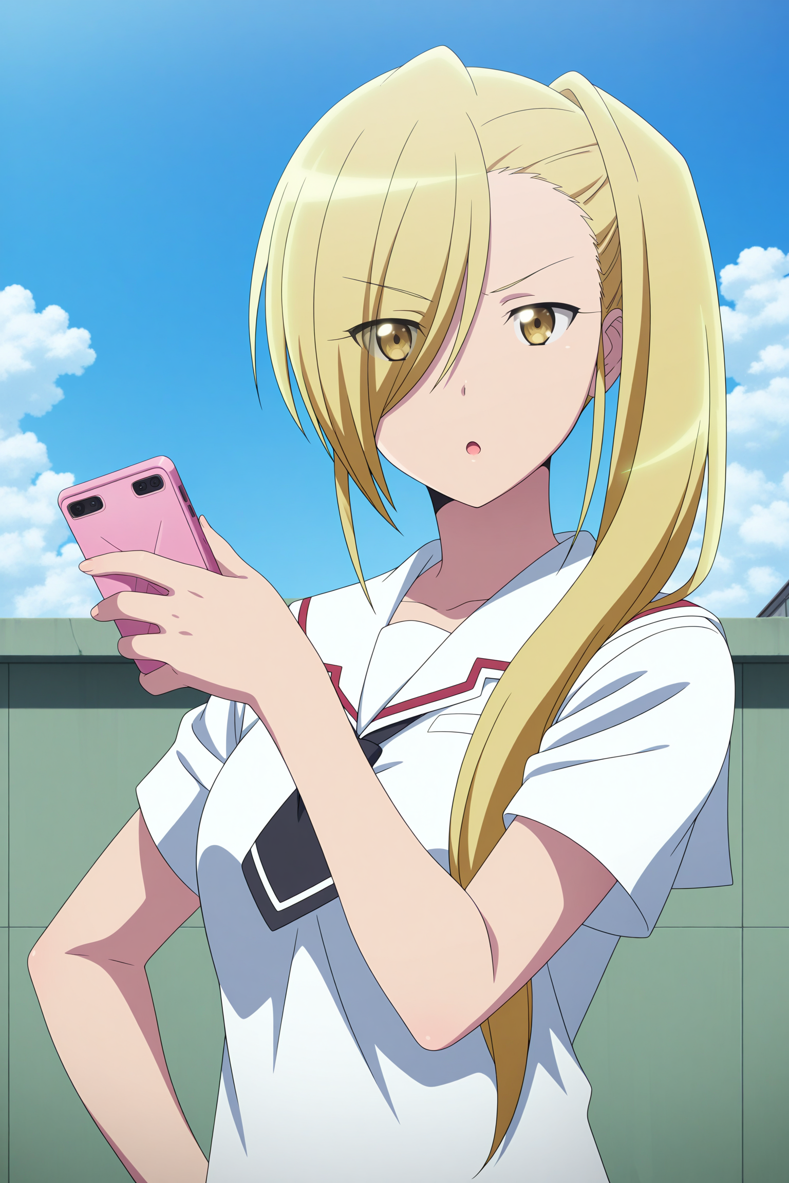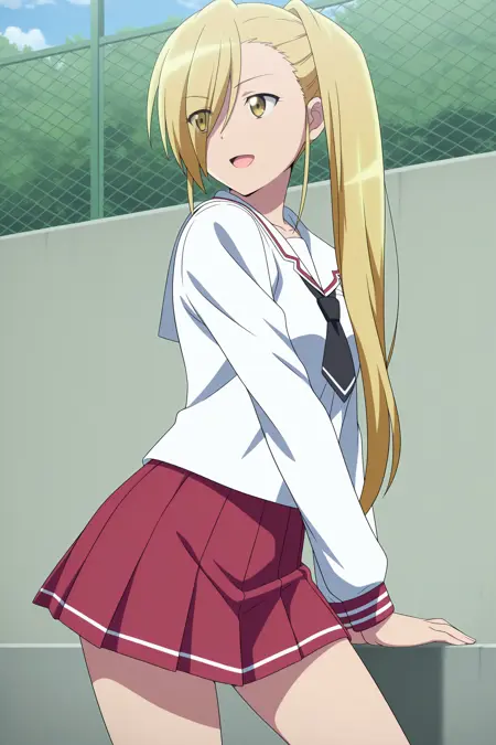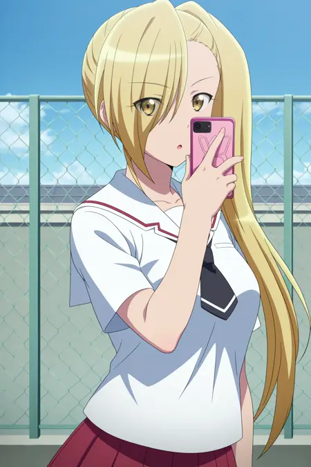 uehara kana, long hair, blonde hair, side ponytail, sidelocks, asymmetrical bangs, hair over one eye, eyes visible through hair, yellow eyes, short sleeves, white shirt, white sailor collar, black necktie, short necktie, red skirt, pleated skirt, striped skirt, white socks, kneehighs, brown footwear, loafers