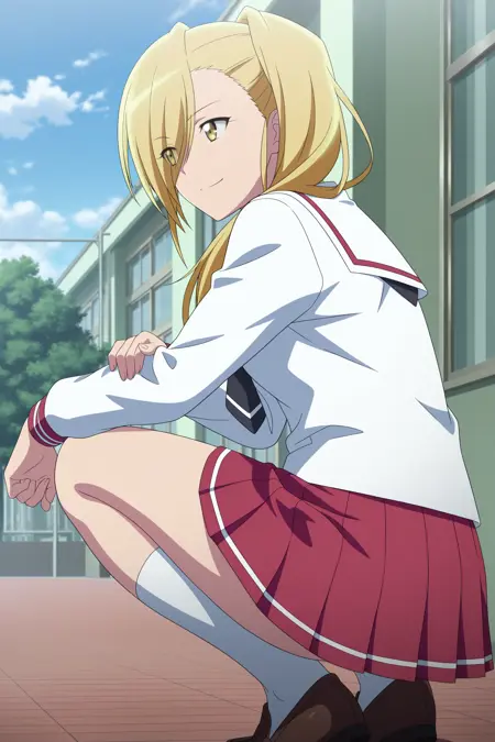 uehara kana, long hair, blonde hair, side ponytail, sidelocks, asymmetrical bangs, hair over one eye, eyes visible through hair, yellow eyes, long sleeves, white shirt, white sailor collar, black necktie, short necktie, red skirt, pleated skirt, striped skirt, white socks, kneehighs, brown footwear, loafers