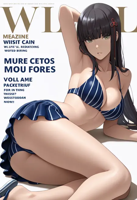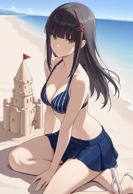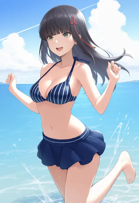 • 泳装: 黑发,长发,齐刘海,发饰,绿眼,蓝色比基尼,竖条纹比基尼,比基尼裙,仅上装
