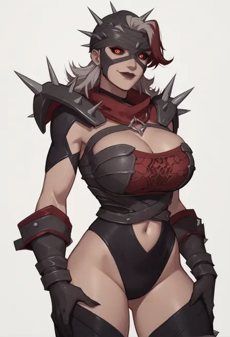 For prompt use - invis gotonai, invis gotonai malice, red eyes, black sclera, grey hair, mask, breasts, spikes, highleg, navel, legwear, gloves, red scarf