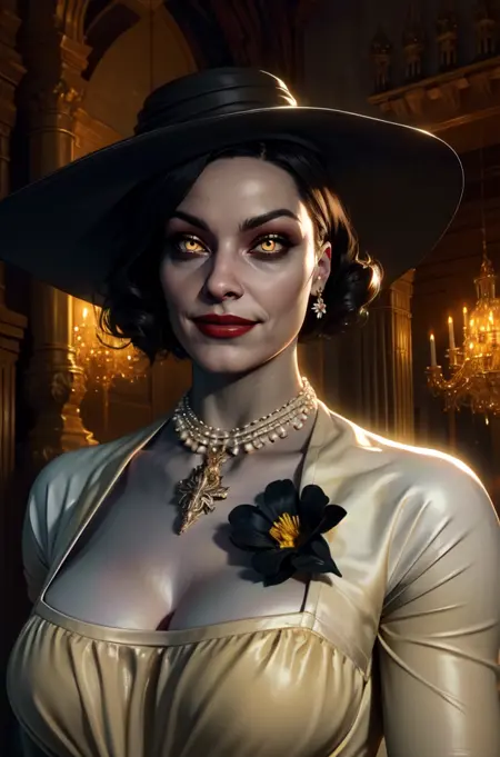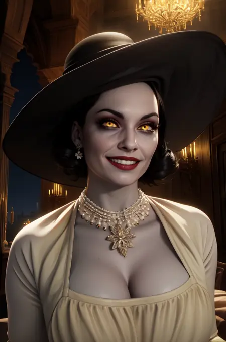 흰 드레스, 모자, 한쪽 귀걸이, 가슴 노출, 진주 목걸이 또는 은색 목걸이, 검은 장갑, 팬티스타킹