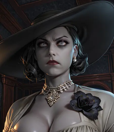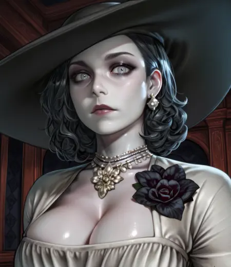 连衣裙上有花朵或黑玫瑰 → 肩部花形胸针或黑色胸针,可能需要添加“黑色”